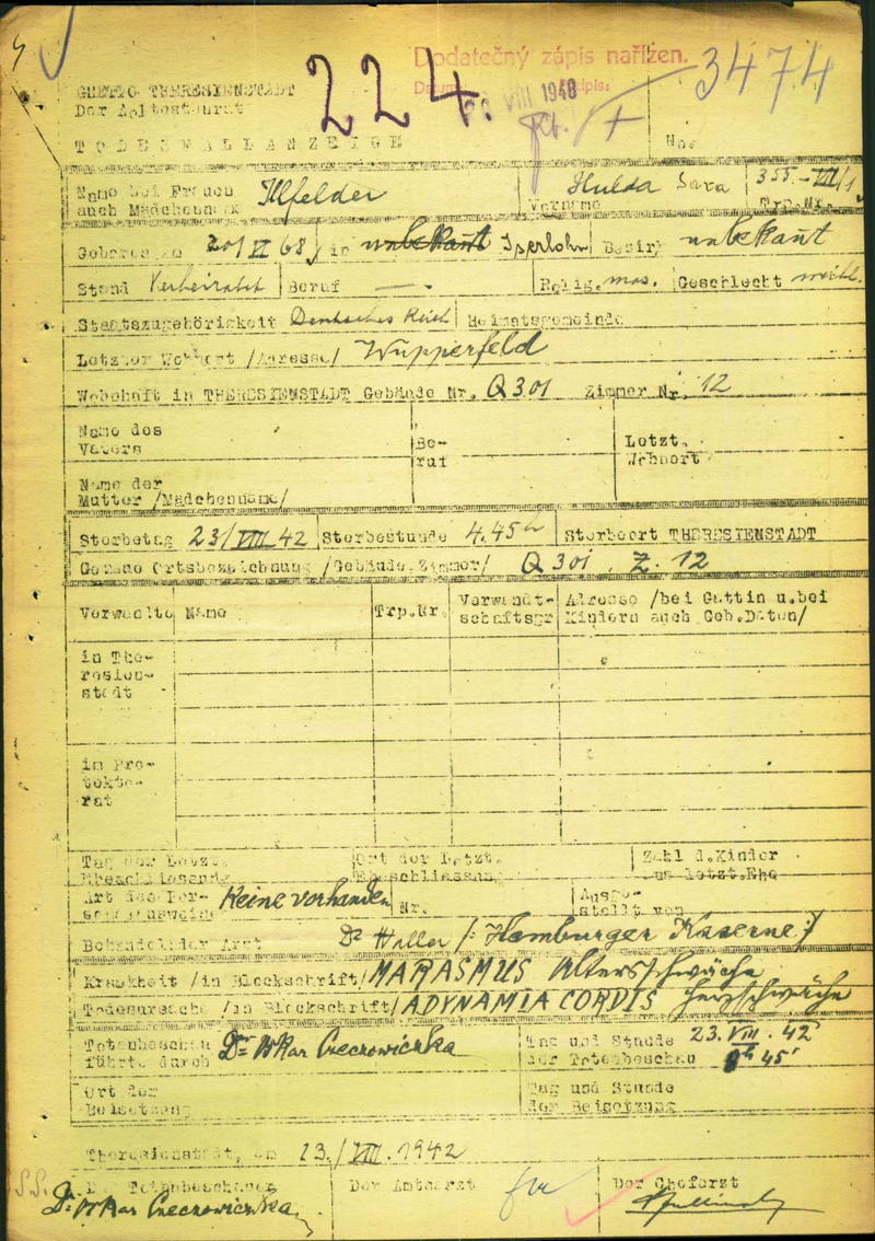 Illfelder Hulda: Death certificate, Ghetto Terezín