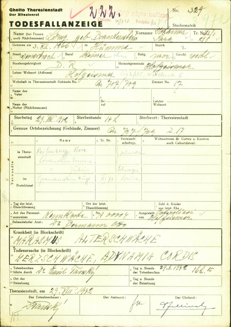 Löwy Johanna: Death certificate, Ghetto Terezín
