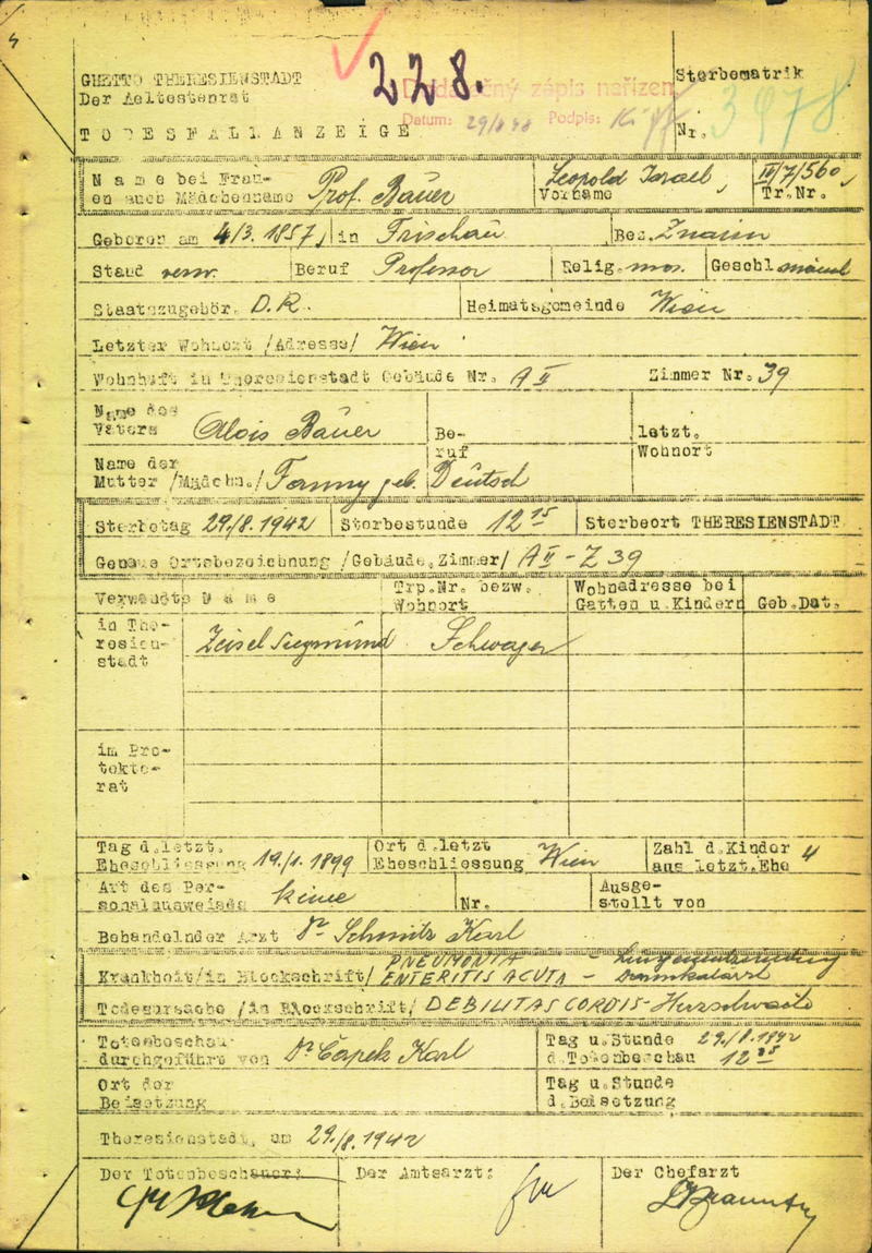 Bauer Leopold: Death certificate, Ghetto Terezín