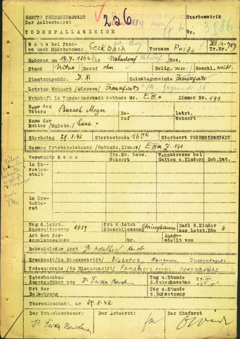 Seckbach Frida: Death certificate, Ghetto Terezín