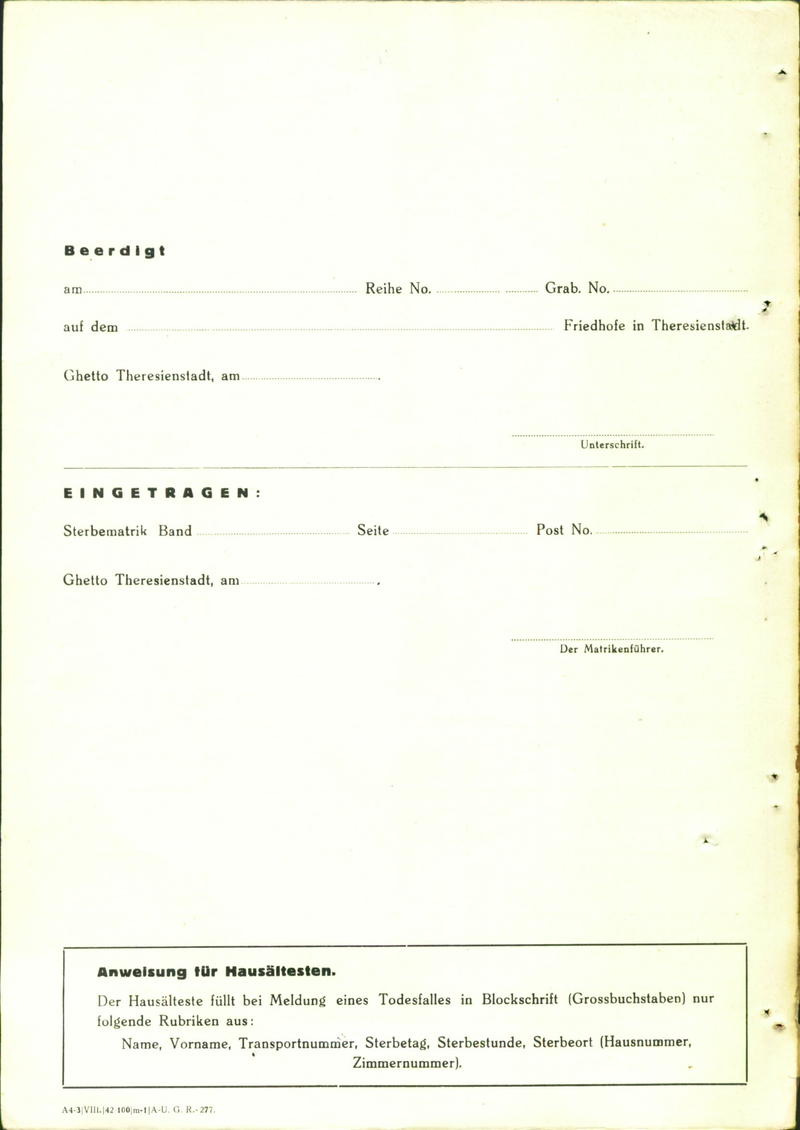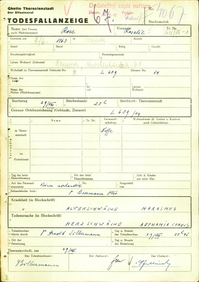 Rose Rosalie: Death certificate, Ghetto Terezín