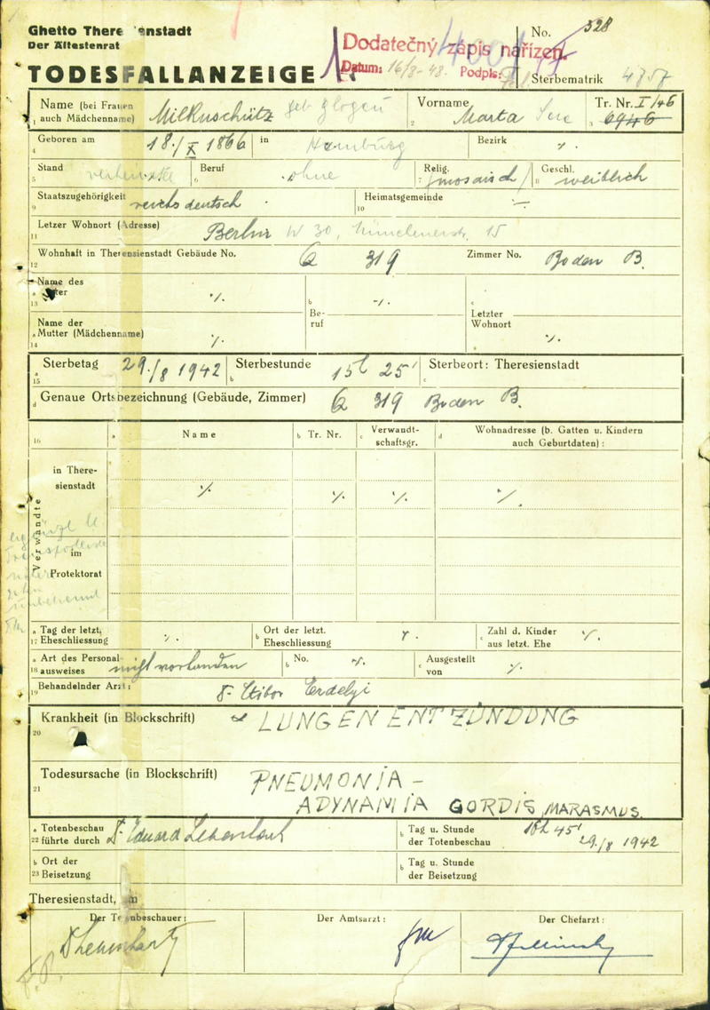 Milkuschütz Martha: Death certificate, Ghetto Terezín