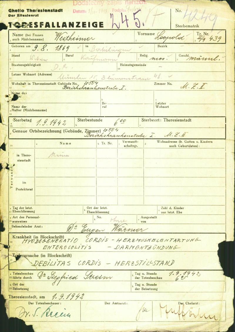 Westheimer Leopold: Death certificate, Ghetto Terezín