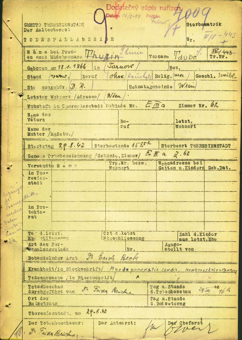 Thurin Taube: Death certificate, Ghetto Terezín