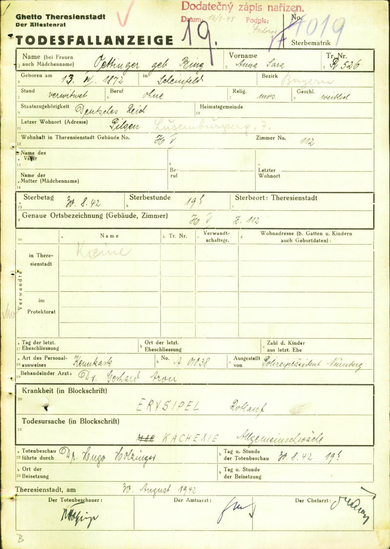 Öttingerová Anna: Death certificate, Ghetto Terezín