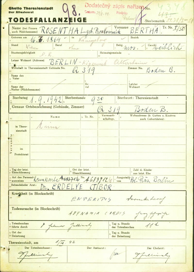 Rosenthal Bertha: Death certificate, Ghetto Terezín