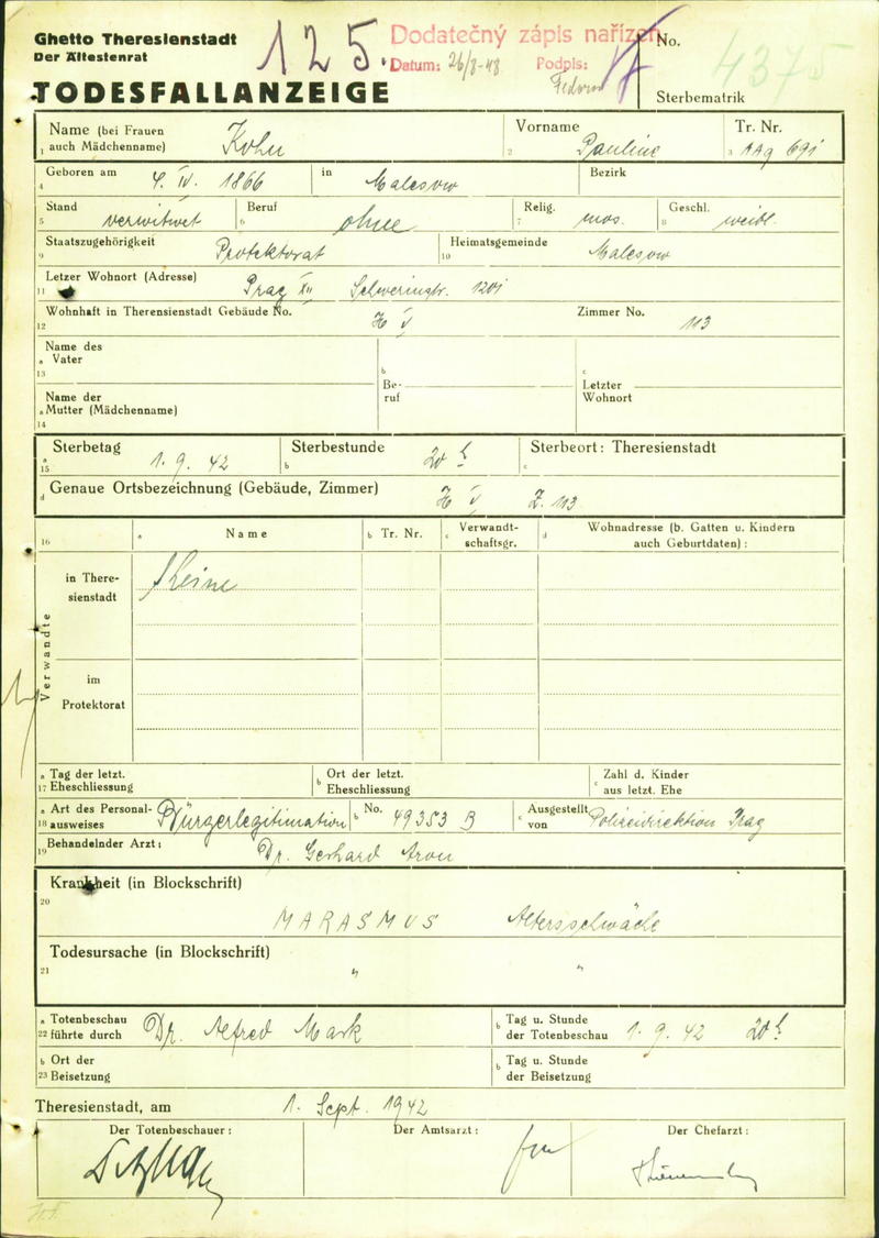 Kohnová Paulina: Death certificate, Ghetto Terezín