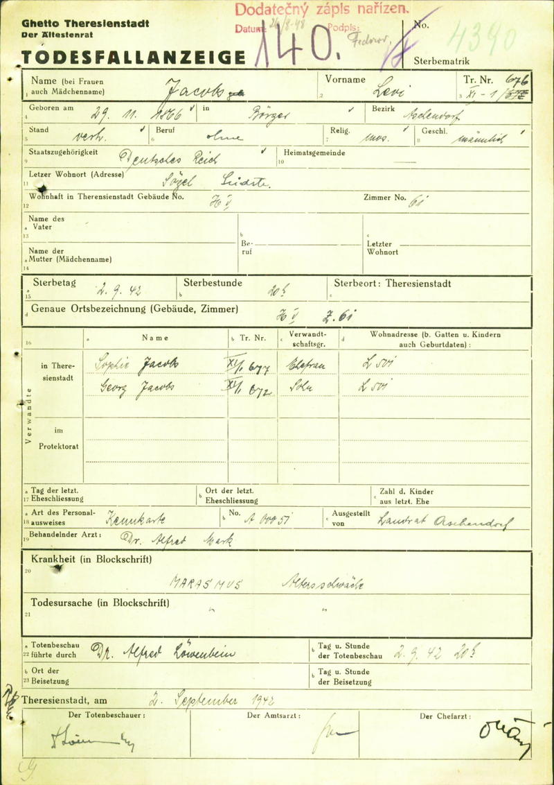 Jacobs Levi: Death certificate, Ghetto Terezín