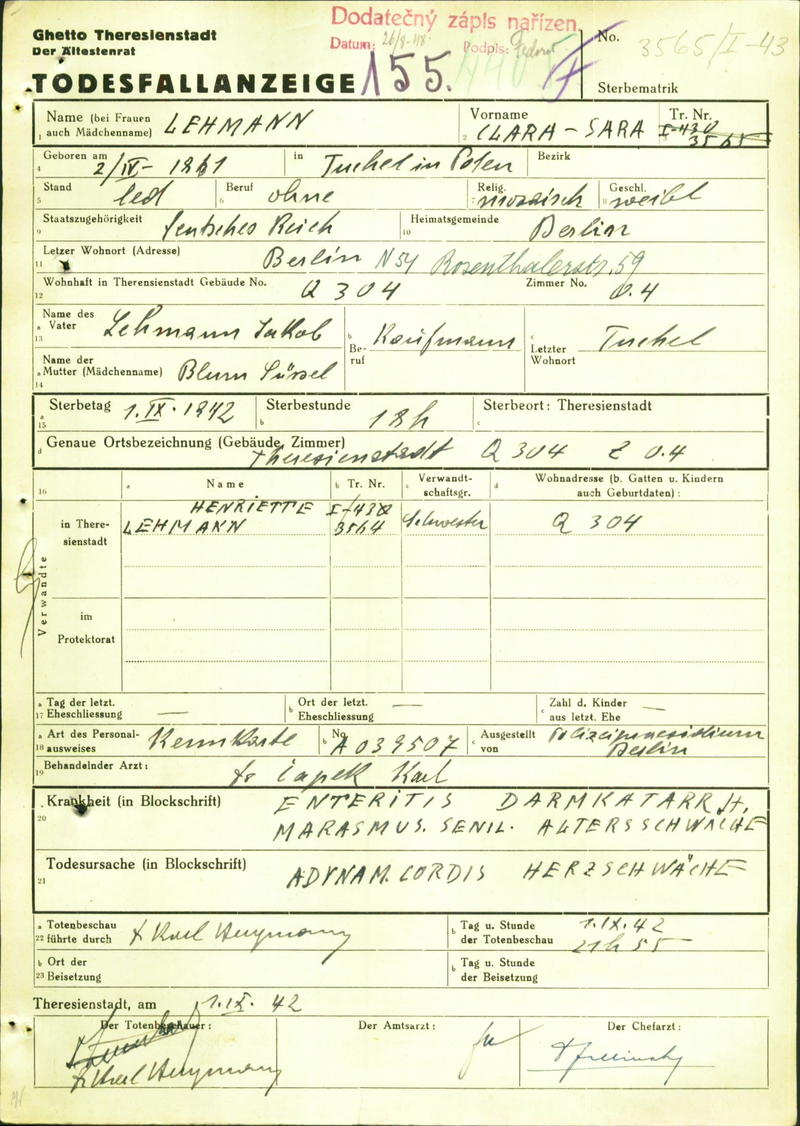 Lehmann Klara: Death certificate, Ghetto Terezín