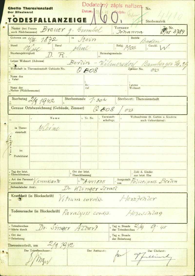 Brauer Johanna: Death certificate, Ghetto Terezín