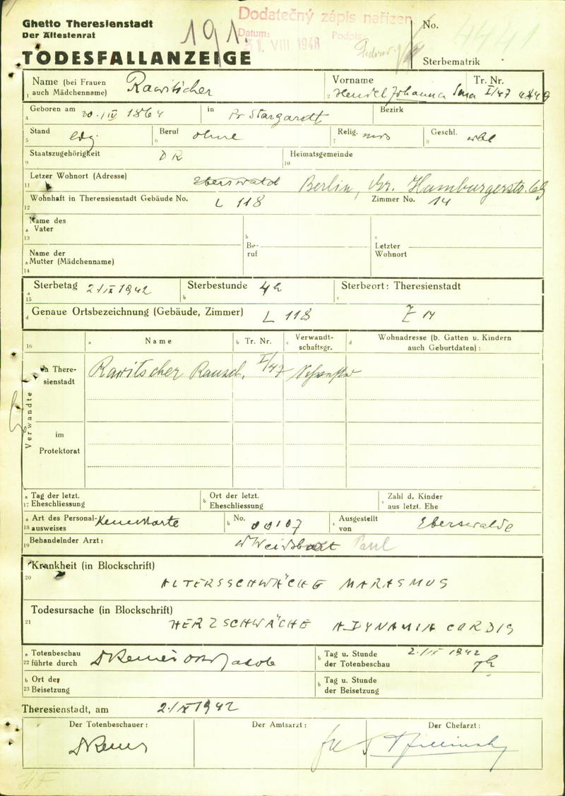 Rawitscher Johanna: Death certificate, Ghetto Terezín