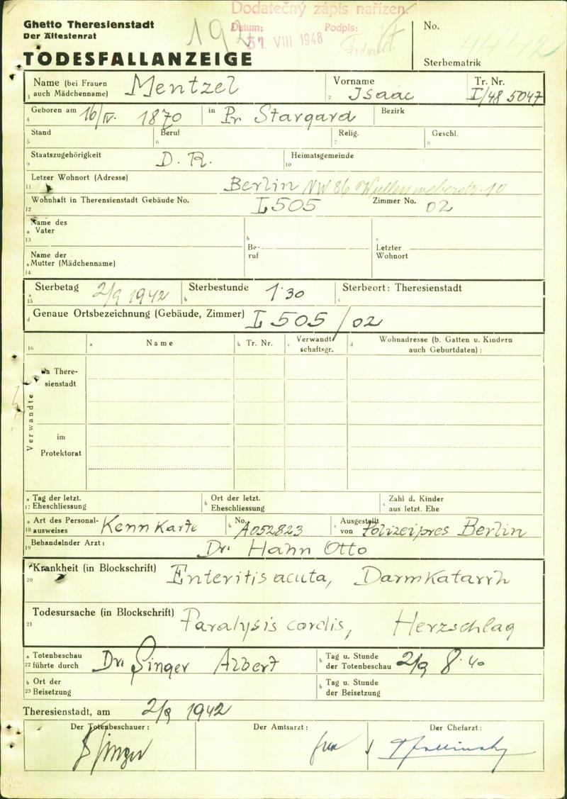 Mentzel Isaac: Death certificate, Ghetto Terezín
