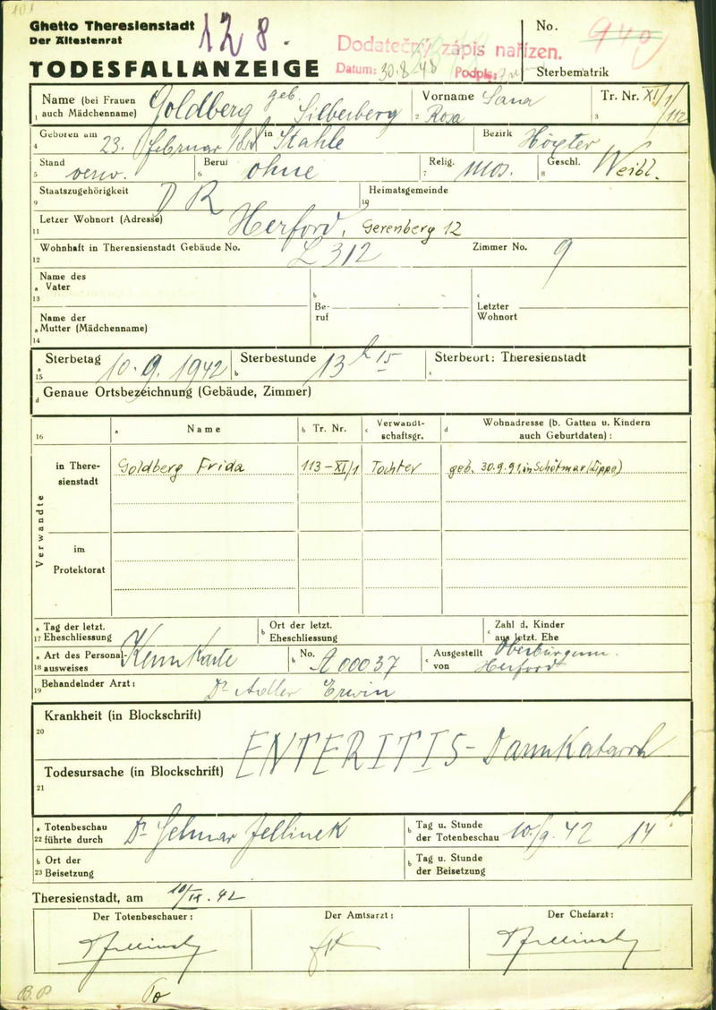 Goldberg Rosa: Death certificate, Ghetto Terezín