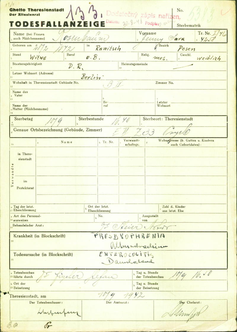 Rosenbaum Jenny: Death certificate, Ghetto Terezín