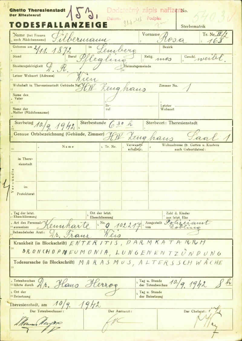 Silbermann Rosa: Death certificate, Ghetto Terezín