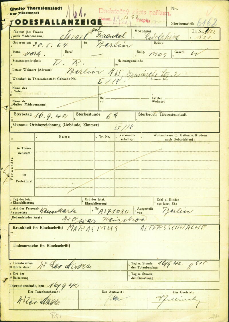Israel Rudolphine: Death certificate, Ghetto Terezín