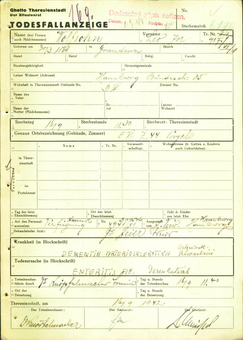 Wolfsohn Leo: Death certificate, Ghetto Terezín