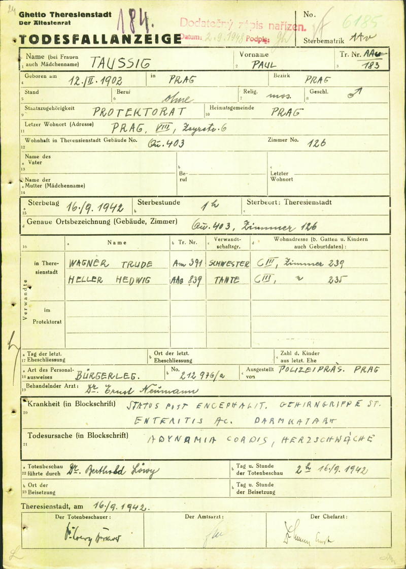 Taussik Pavel: Death certificate, Ghetto Terezín