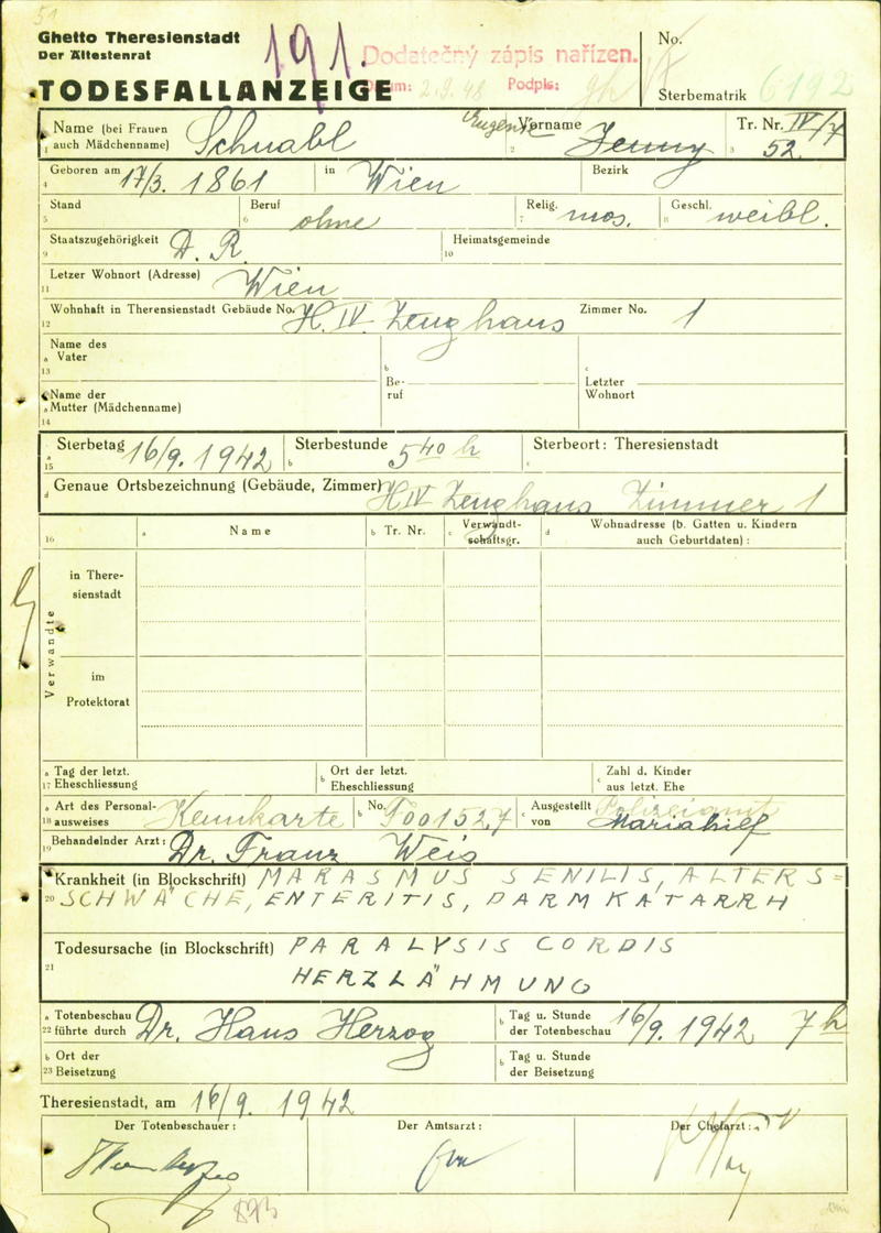 Schnabel Eugenie: Death certificate, Ghetto Terezín
