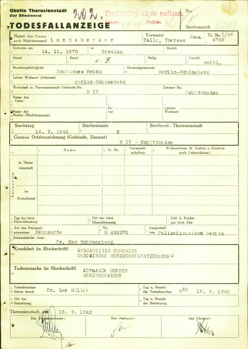 Landsberger Vally: Death certificate, Ghetto Terezín