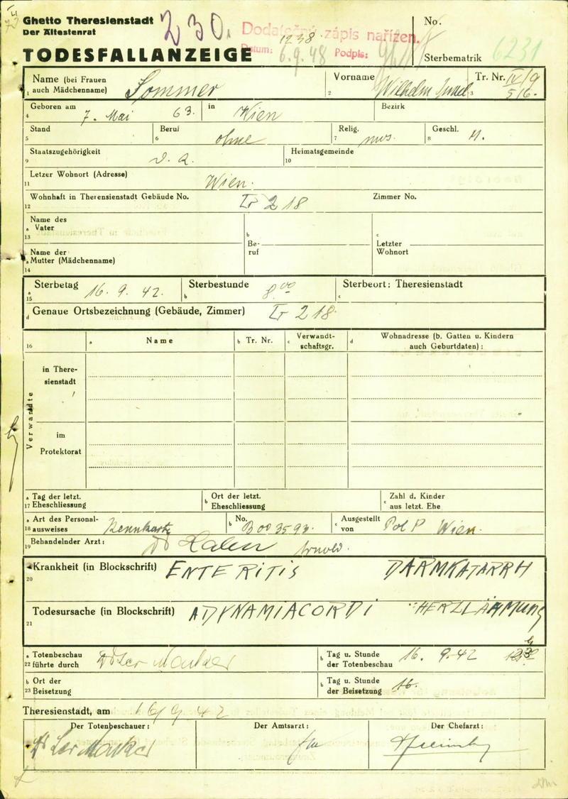 Sommer Wilhelm: Death certificate, Ghetto Terezín