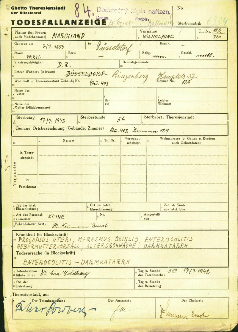 Marchand Wilhelmine: Death certificate, Ghetto Terezín