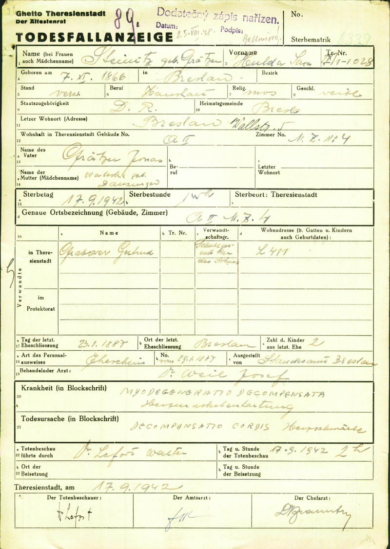 Steinitz Hulda: Death certificate, Ghetto Terezín