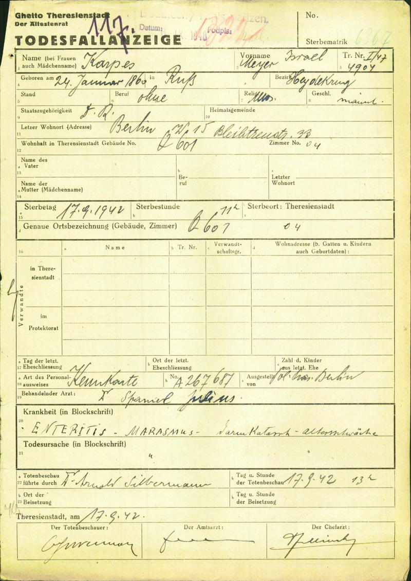 Karpes Meyer: Death certificate, Ghetto Terezín