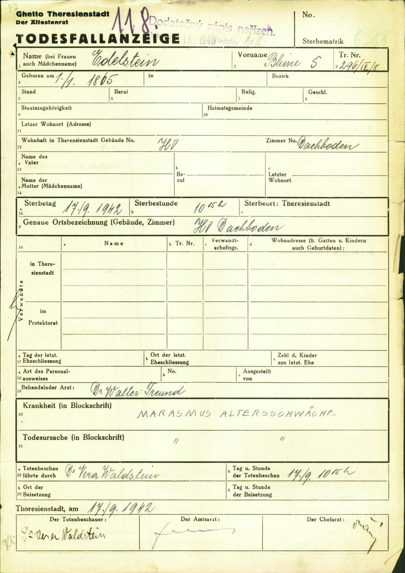 Edelstein Blime: Death certificate, Ghetto Terezín