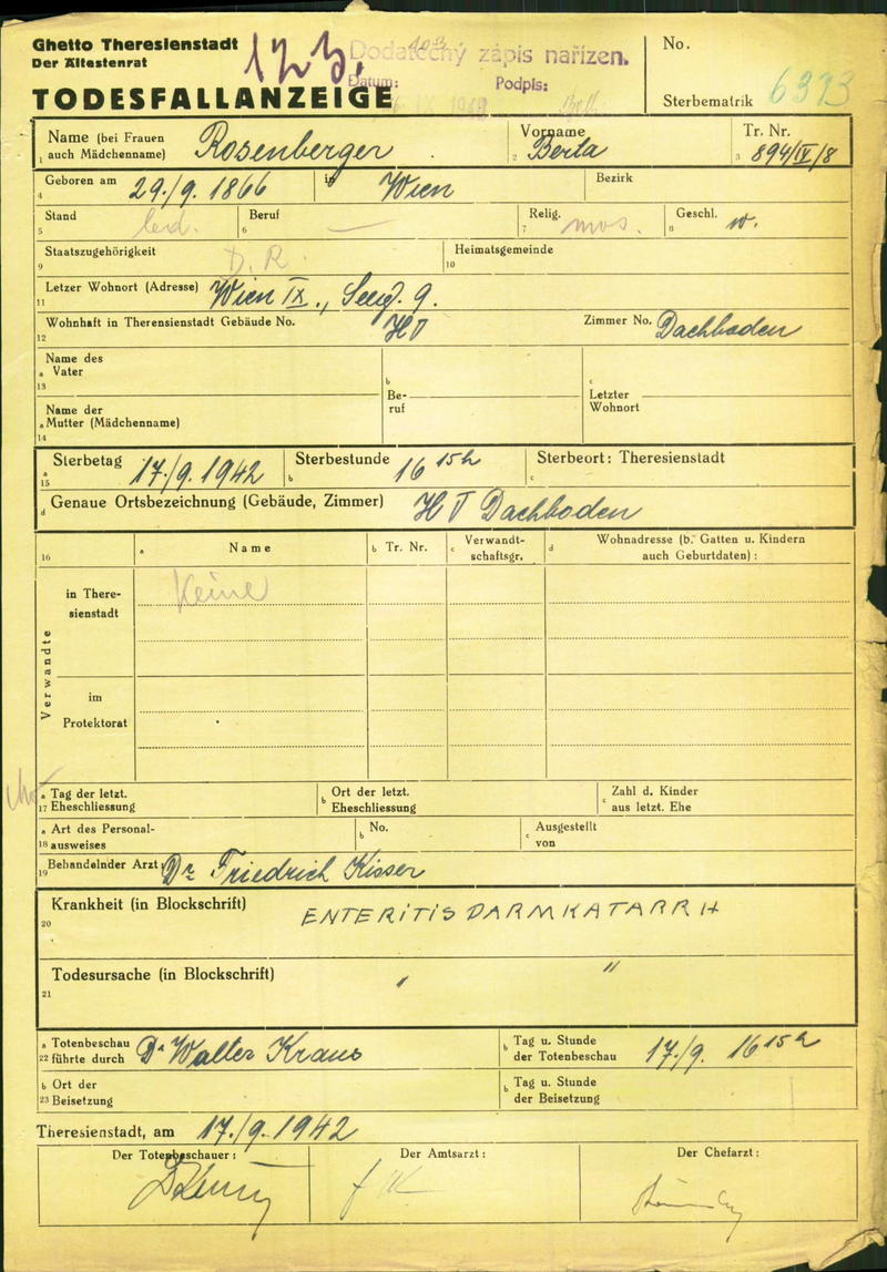 Rosenberger Berta: Death certificate, Ghetto Terezín