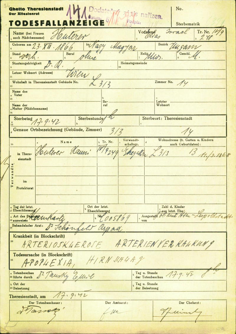 Huterer Elias: Death certificate, Ghetto Terezín