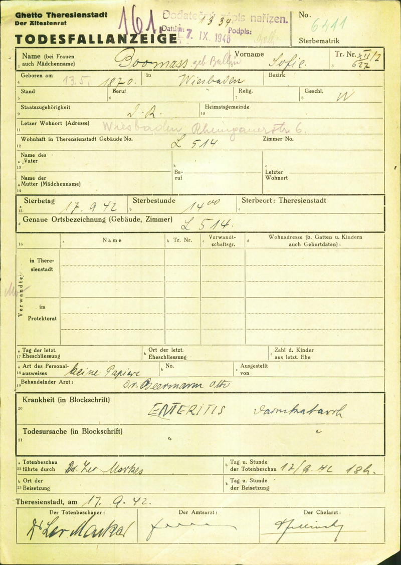 Bormass Sofie: Death certificate, Ghetto Terezín