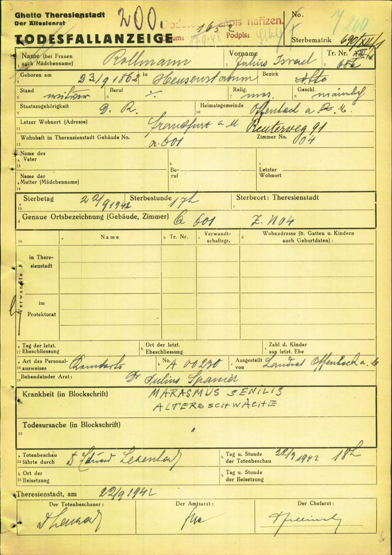 Rollmann Julius: Death certificate, Ghetto Terezín