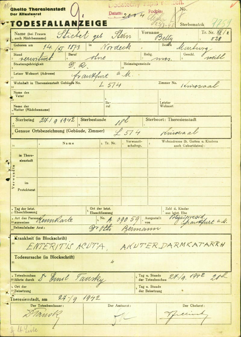 Stiebel Betty: Death certificate, Ghetto Terezín
