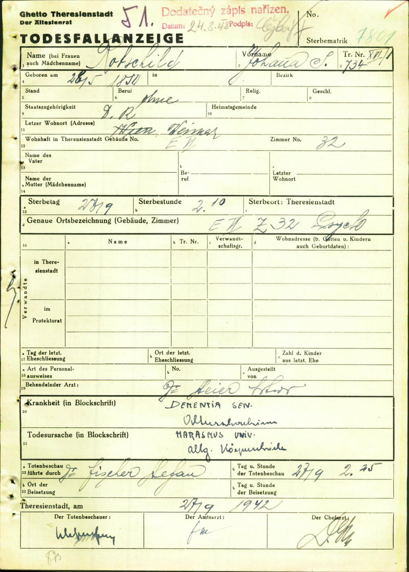 Rotschild Johanna: Death certificate, Ghetto Terezín