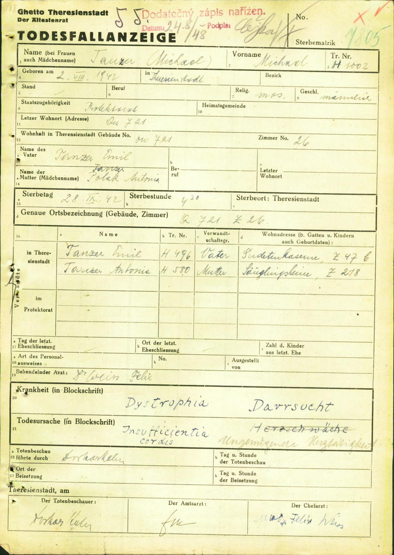 Tanzer Michal: Death certificate, Ghetto Terezín