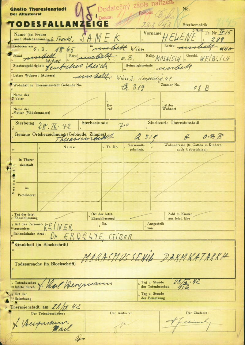 Szamek Helene: Death certificate, Ghetto Terezín