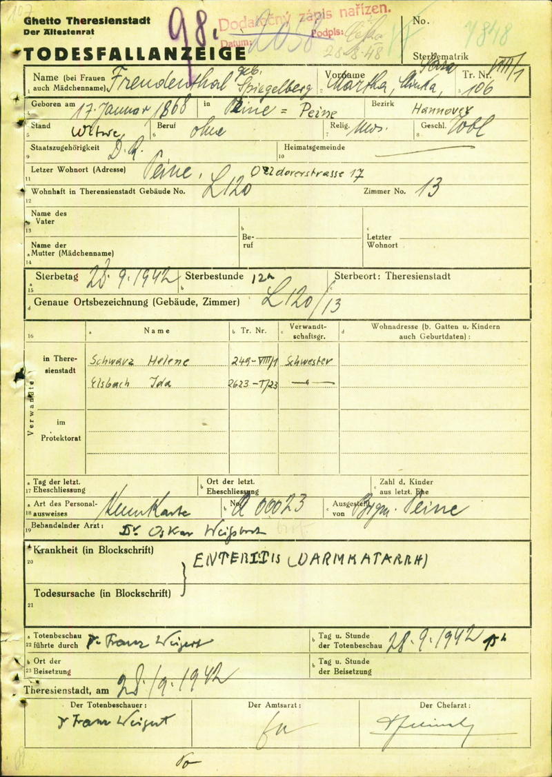 Freudenthal Martha: Death certificate, Ghetto Terezín