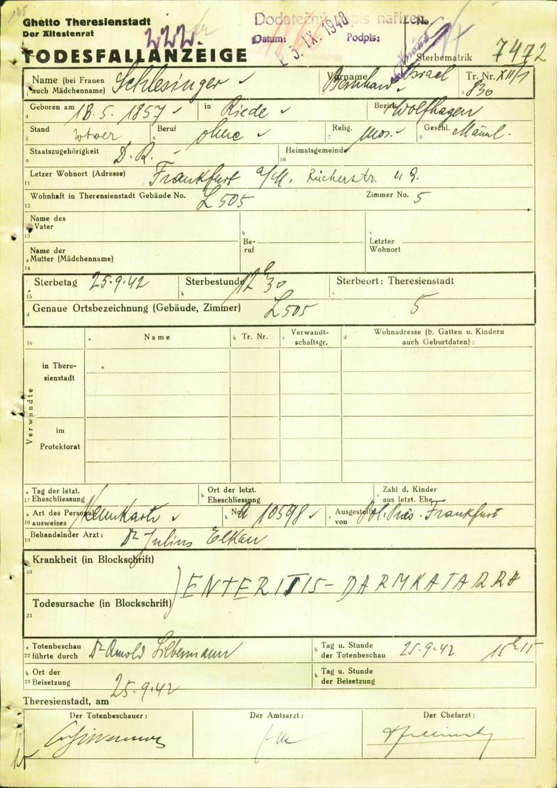 Schlesinger Bernhard: Death certificate, Ghetto Terezín