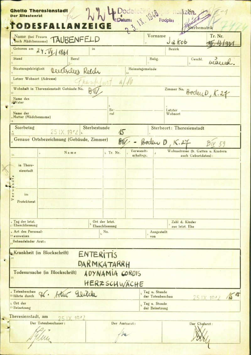 Taubenfeld Jakob: Death certificate, Ghetto Terezín