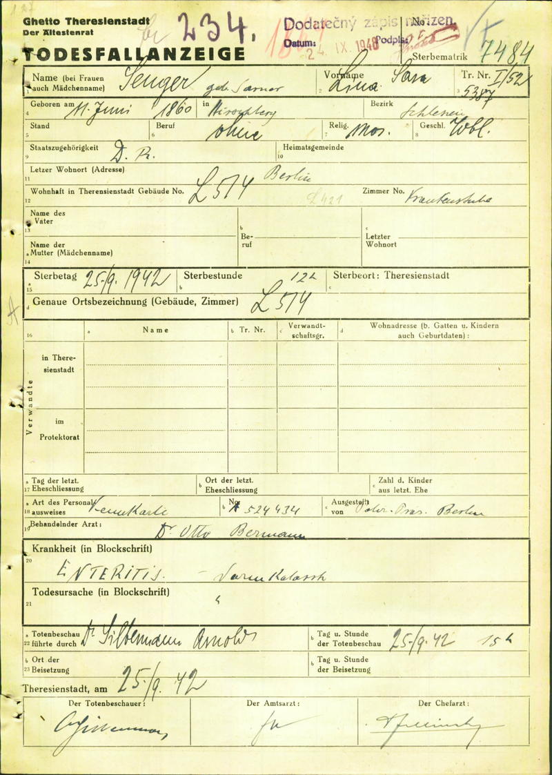Senger Lina: Death certificate, Ghetto Terezín