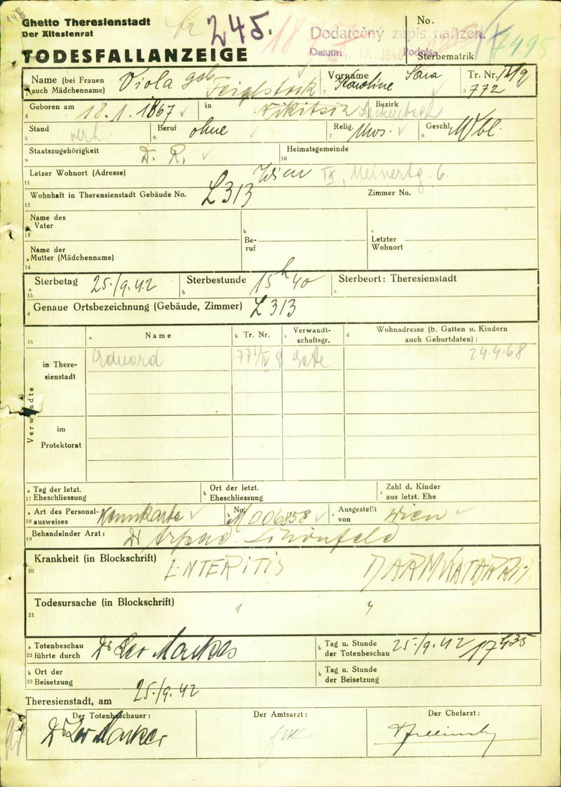 This database contains the names and fates of those who were deported from the territory of today’s Czech Republic, be it their homeland or may they have been deported to the Theresienstadt ghetto before from different european countries. Further, it contains basic information on those men, women and children, most of whom were Roma or Sinti, who died as prisoners of the so-called „Gypsy camp I“ Lety u Písku.
