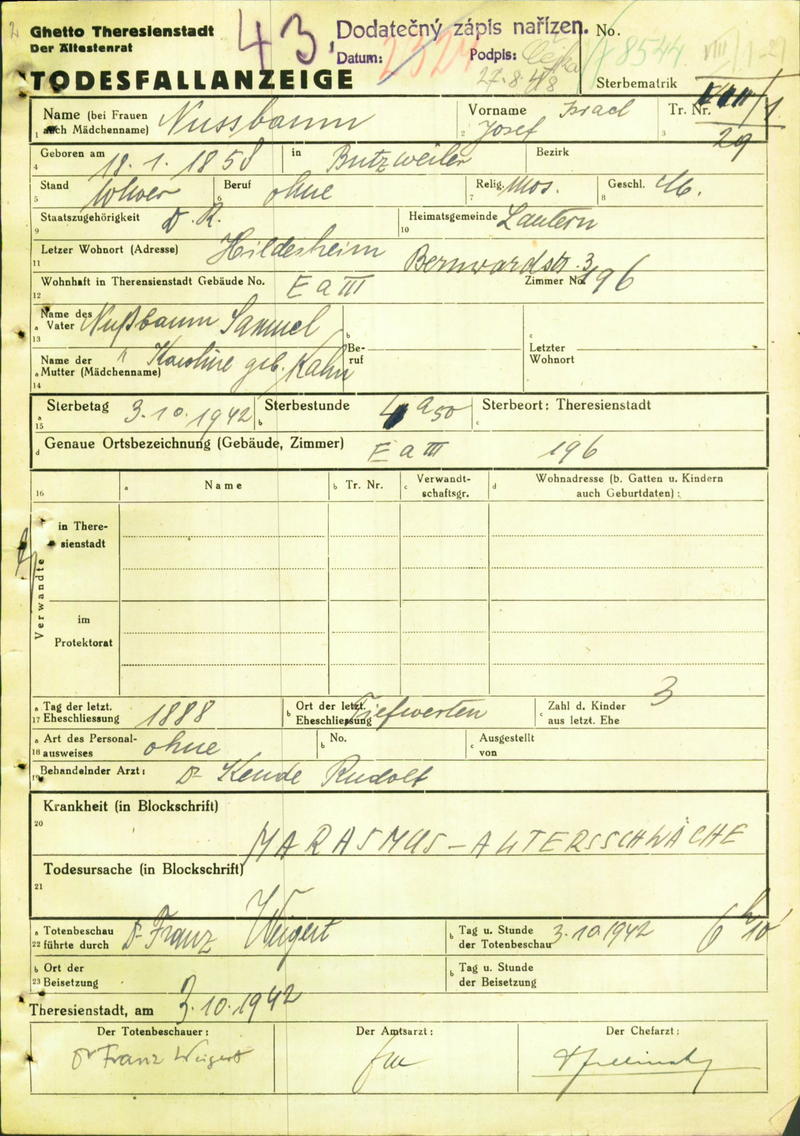 Nussbaum Josef: Death certificate, Ghetto Terezín