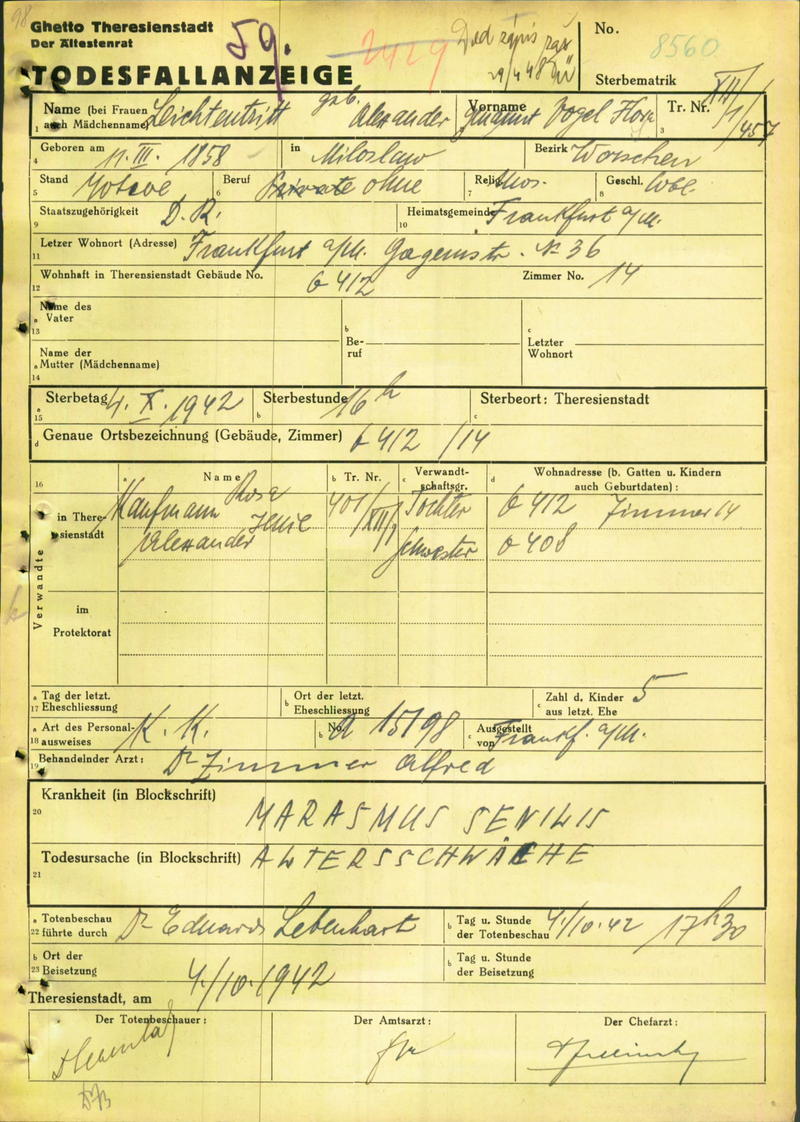 Leichtentritt Flora: Death certificate, Ghetto Terezín