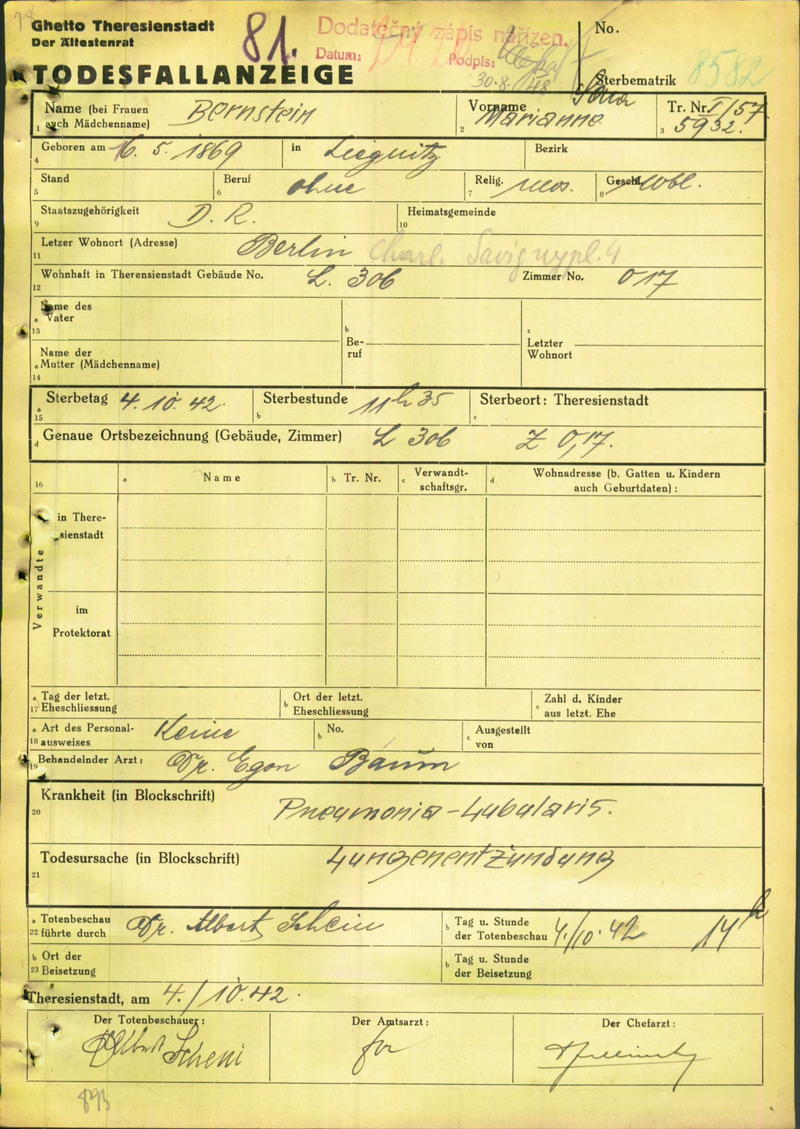 Bernstein Marianne: Death certificate, Ghetto Terezín