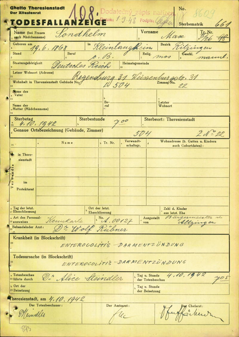 Sondhelm Max: Death certificate, Ghetto Terezín