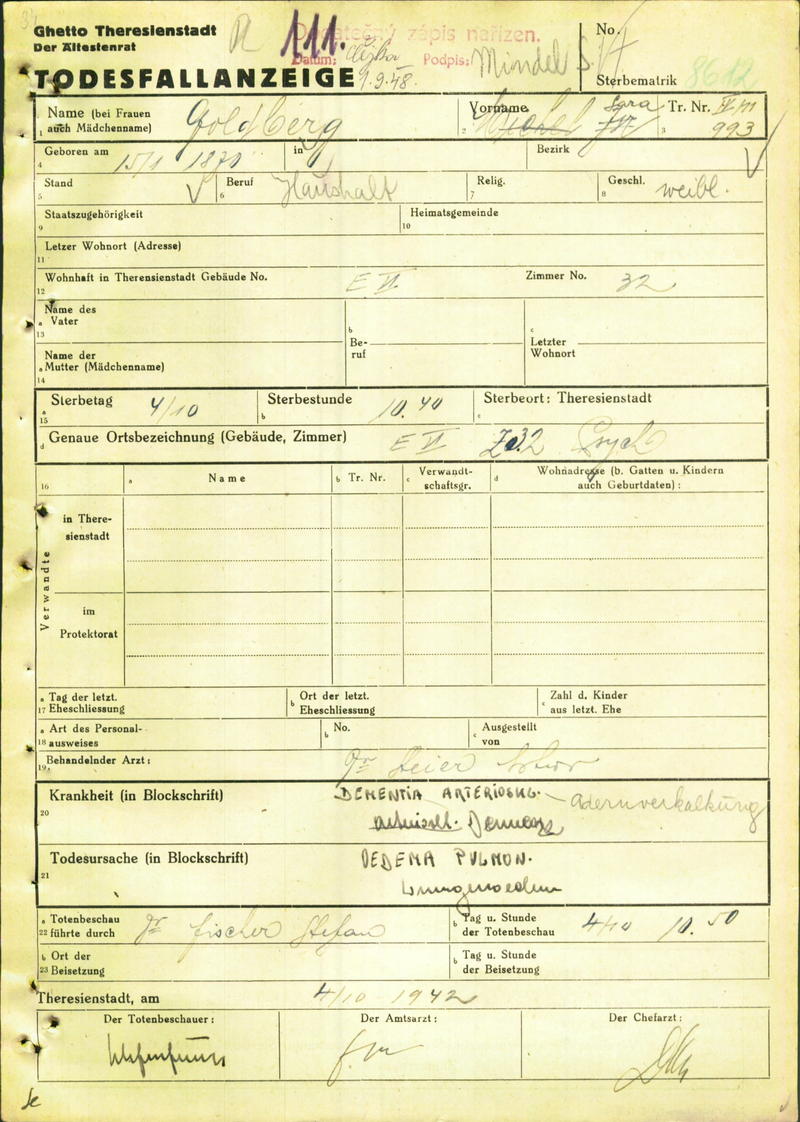 Goldberg Mindel: Death certificate, Ghetto Terezín