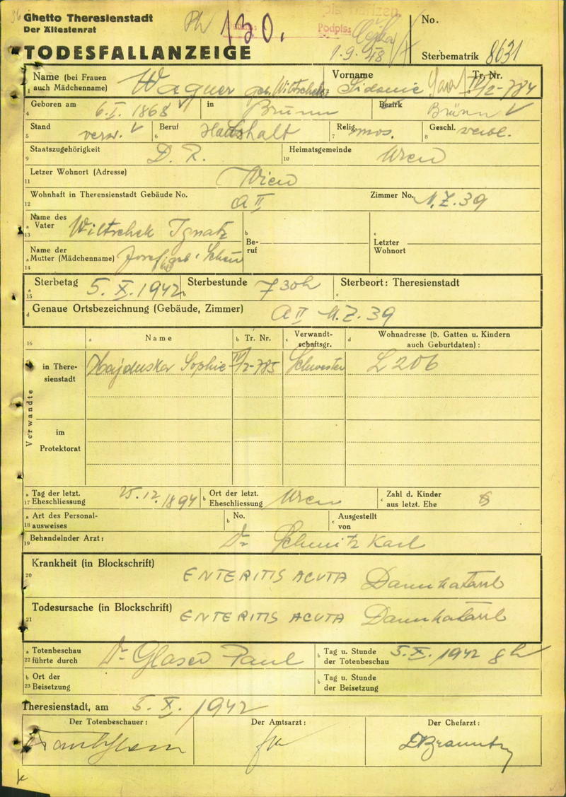 Wagner Sidonie: Death certificate, Ghetto Terezín