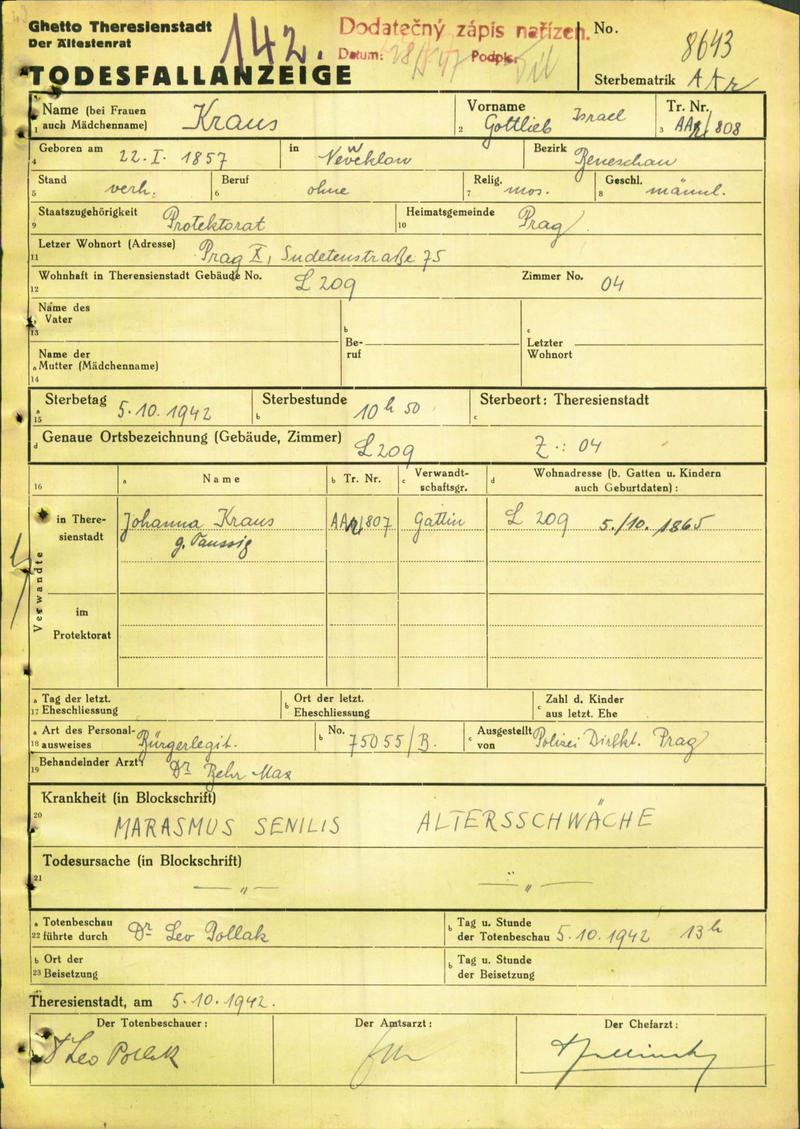 Kraus Bohumil: Death certificate, Ghetto Terezín