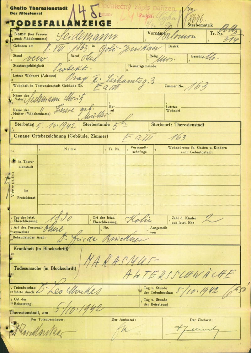 Seidemann Šalomon: Death certificate, Ghetto Terezín